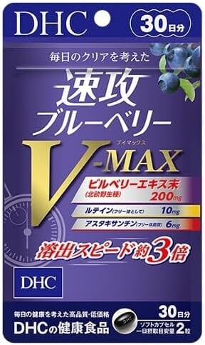 速攻ブルーベリーV-MAXはビルベリーエキス200mgの高配合。DHC社従来の「ブルーベリーエキス」に比べて、溶出スピードが約3倍と効き目が早いのも特徴です。安いサプリメントでいち早く実感したい方に嬉しいサプリメントです。