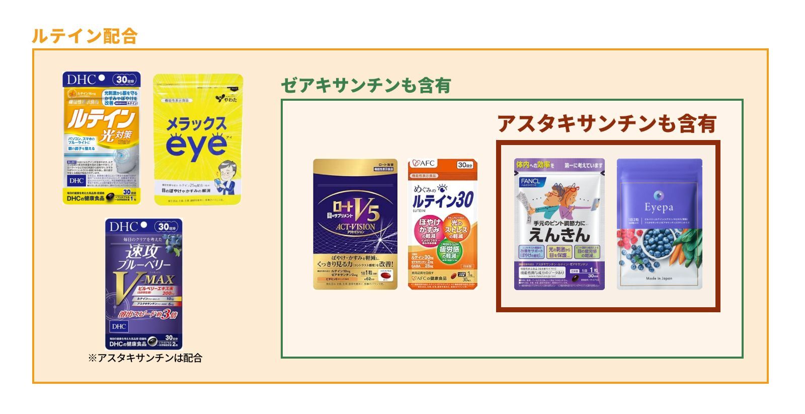 ①ルテイン、ゼアキサンチン、アスタキサンチンの機能性成分配合