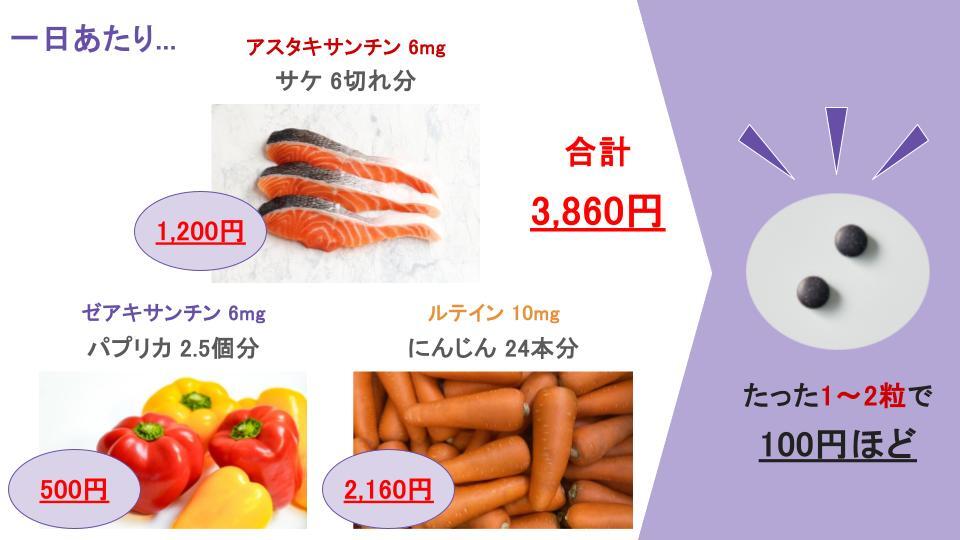 ルテイン・アスタキサンチン・ゼアキサンチンなどの栄養素をふまえて献立を考え、食事としてとるのはかなり大変です。