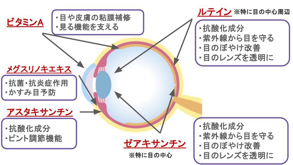 ルテインやビルベリーはもちろん、ゼアキサンチン・アスタキサンチンなど、抗酸化作用のある成分を複合的に摂ることで、より広く目の健康をサポートできるといわれています。